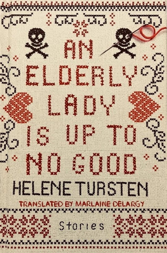 An Elderly Lady Is Up to No Good by Helene Tursten. Trans. by Marlaine Delargy. The book cover is done in needlepoint.