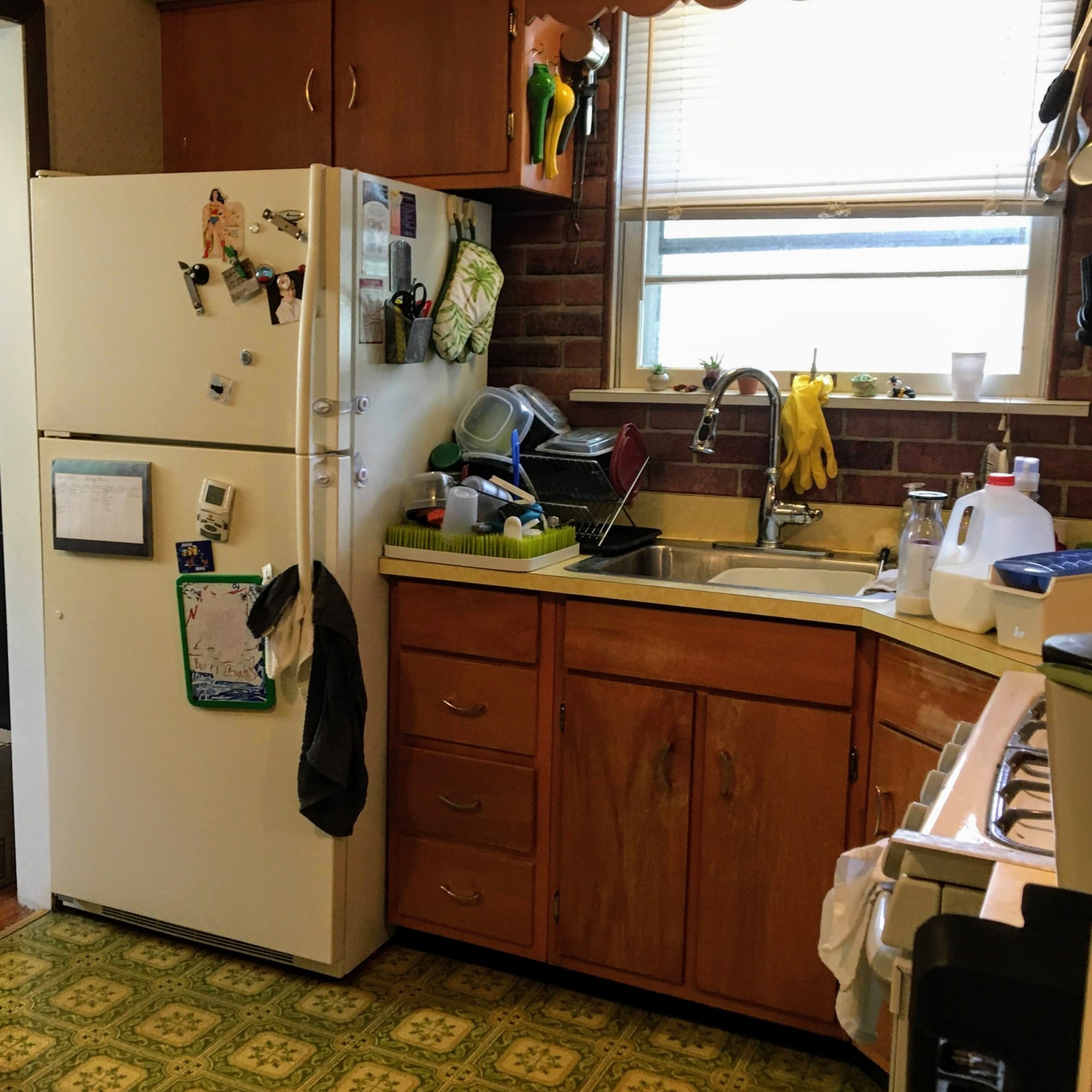 My kitchen (or, at least 3/4 of it). An unholy combination of the 1950s worn cabinetry, a 70s (bad) makeover (see floor), weird choices (brick/paneling), and colors that won’t coordinate. Also, the star of this story, the 1980s fridge.