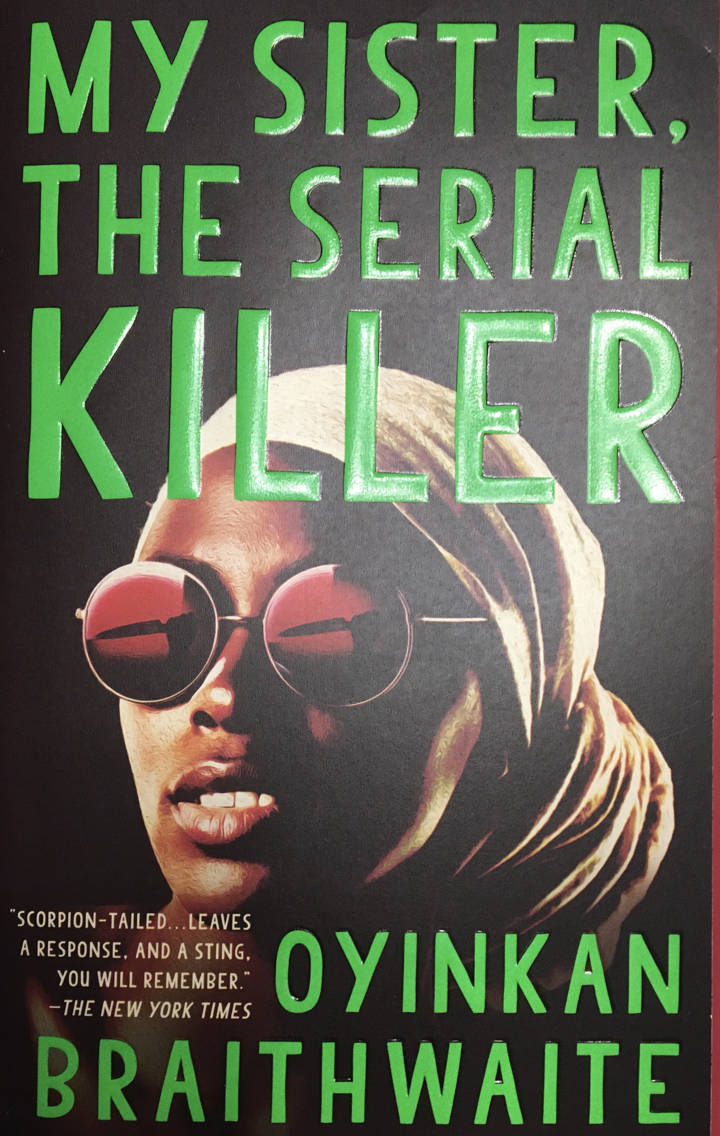 Cover shows a beautiful young black woman wearing stylish sunglasses and a headwrap. The title says: My Sister, the Serial Killer by Oyinkan Braithwaite